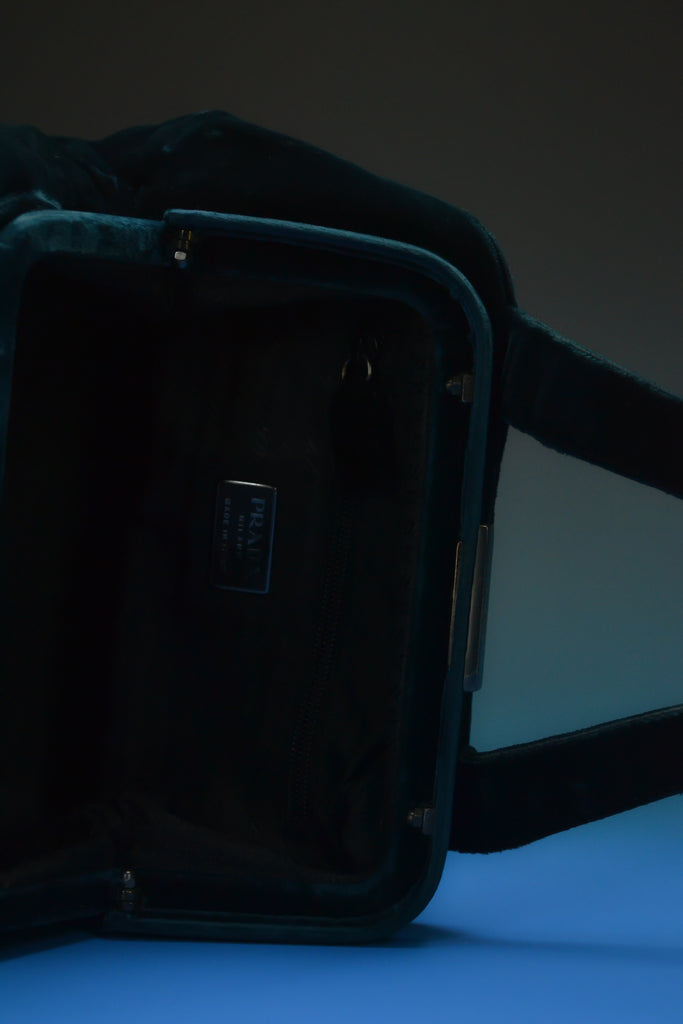 This timeless Prada Velvet Handbag is a sophisticated and chic addition to any wardrobe. Its classic shape is complemented by a deep, warm shade of teal, and luxurious silk velvet fabric. The doctors clasp closure adds a touch of elegance.