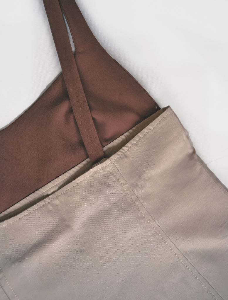 Beige and brown silk fabrication. Above knee Length. Extremely flattering cut.